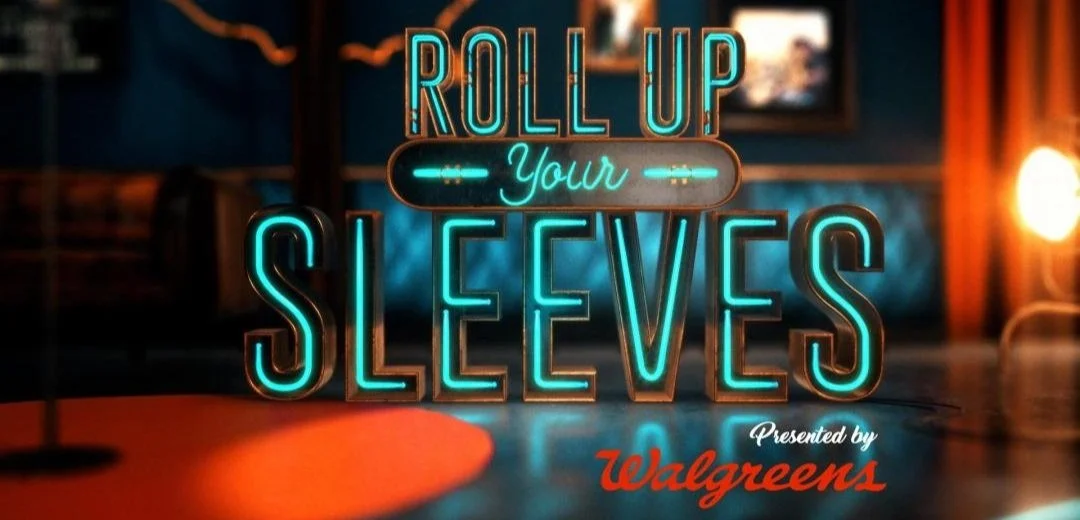 Neon sign in a bar or lounge that says "Roll Up Your Sleeves," with the words "Presented by Walgreens" underneath.